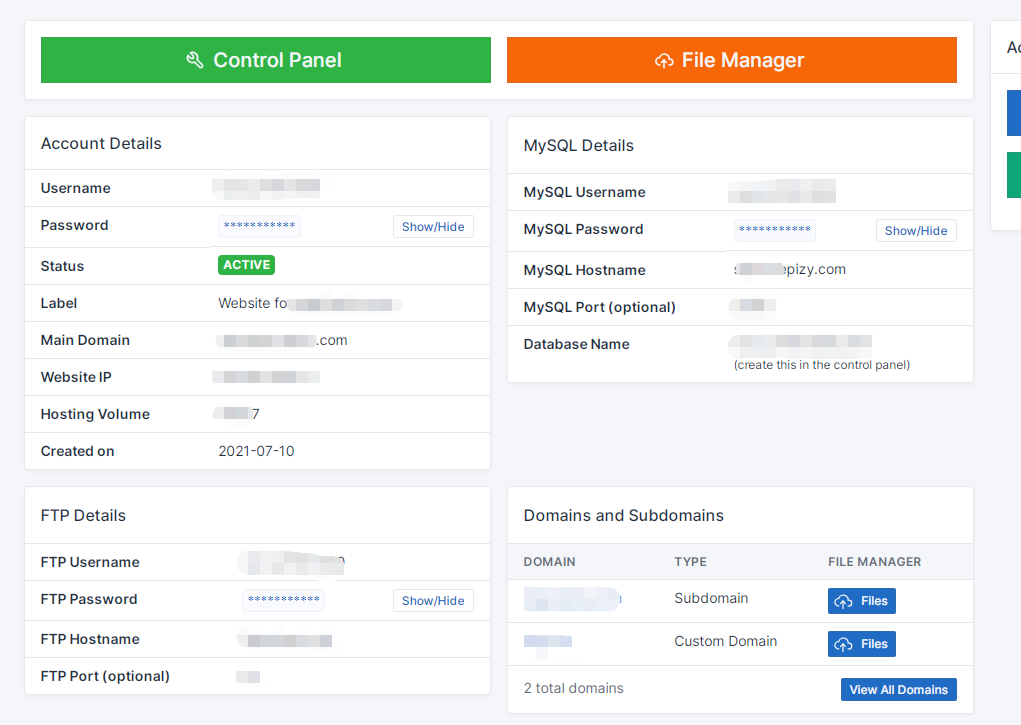 dns为 ns1.epizy.com ns2.epizy.com),填写域名后创建,进入账户管理界面,里面有创建好的 FTP账户、MySQL