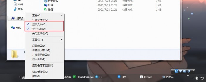 右键【桌面】取消勾选 显示文本 和 显示标题 ,查看选择 大图标 即可设置完成,然后调整输入法(直接拖动输入法浮窗至任务栏),锁定任务栏。